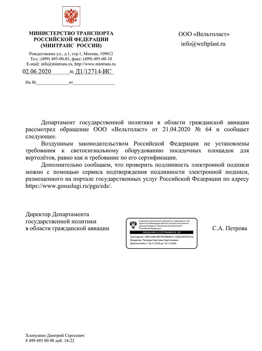 Ответ на запрос о правовых аспектах установки и использования светосигнального оборудования на посадочных площадках где не производятся коммерческие перевозки с более чем 20 пассажиров на борту и вертодромах.