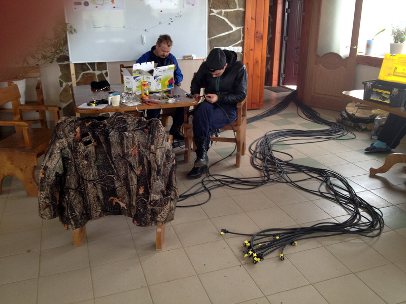 Проводится нарезка кабелей, с запасом на свободную укладку в траншею и заходы на стойки. Для боковых огней с шагом 50 метров кабели готовятся по 54 метра. Производится монтаж разъемов на кабели и по завершению, раскладка кабелей по траншеям и коммутаця огней по всей площадке.