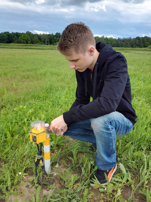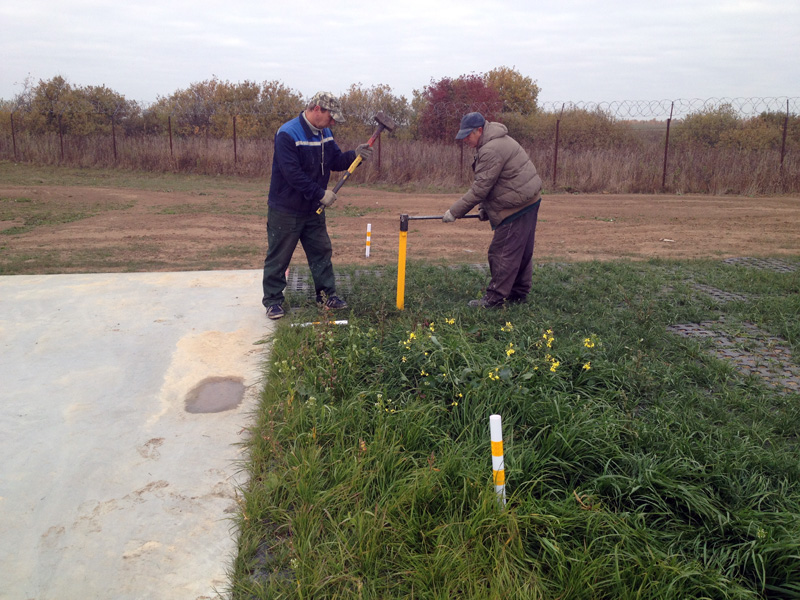 В точках установки опор типа "Игла" проводится забивка металлической части опор в грунт. Опоры забиваются парой монтажников, располагающихся под углом 90 градусов друг к другу, относительно забиваемой опоры.