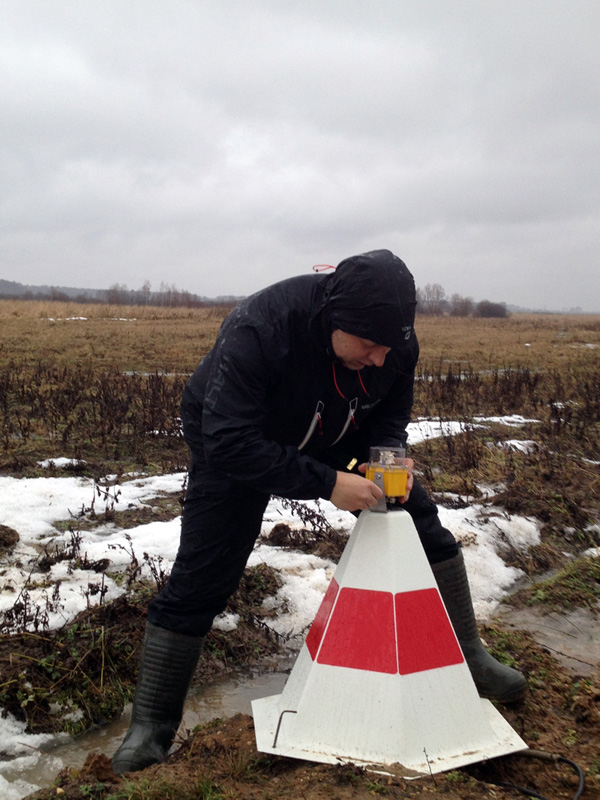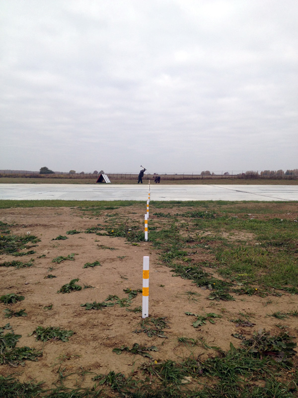 Разметка точного линейного положения опор "Игла" или пирамид на боковых полосах ВПП и протяженных участках РД, МРД, перронов, производится при помощи нивелира.