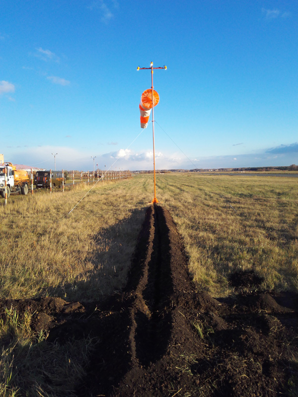 вдоль рулежных дорожек, перронов и трасс к щитам управления, подвода электропитания и местам установки ветроуказателей.