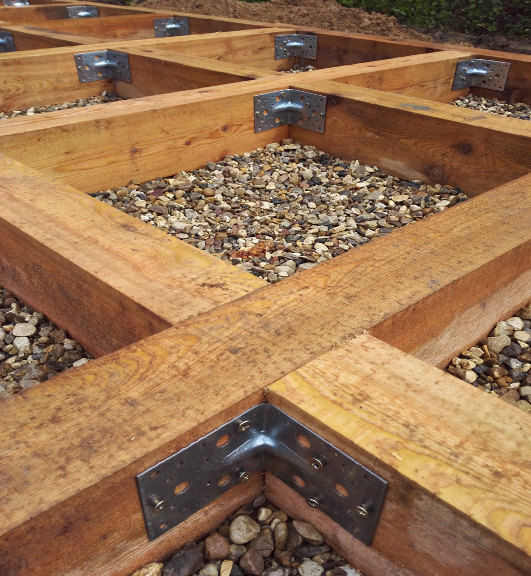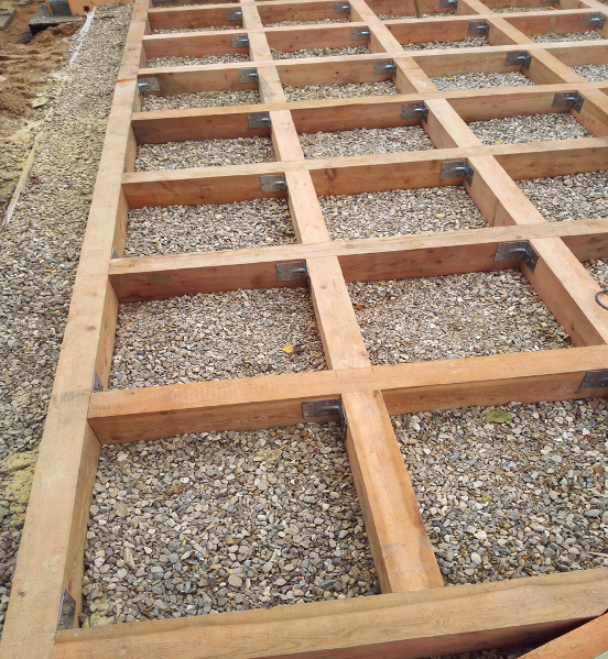 Площадка заливается цементно-песчаной стяжкой или бетоном на щебень или гравий. На гидроизоляционный слой укладываются лаги или размещаются между балками, в зависимости от проекта.