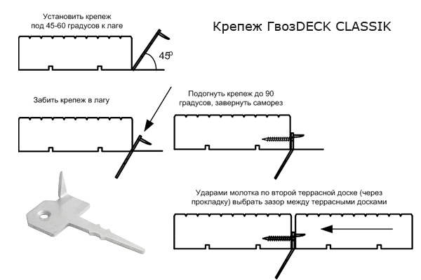 Для крепления используются невидимые снаружи стальные оцинкованные крепежные элементы ГвозDECK CLASSIK размером 60*30*2.5 мм,