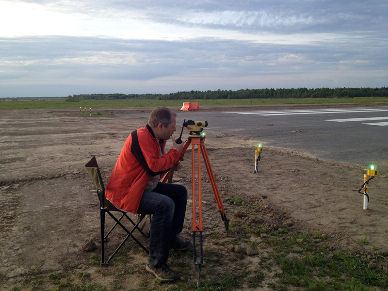 Разметка точного линейного положения опор "Игла" или пирамид на боковых полосах ВПП и протяженных участках РД, МРД, перронов, производится при помощи нивелира.